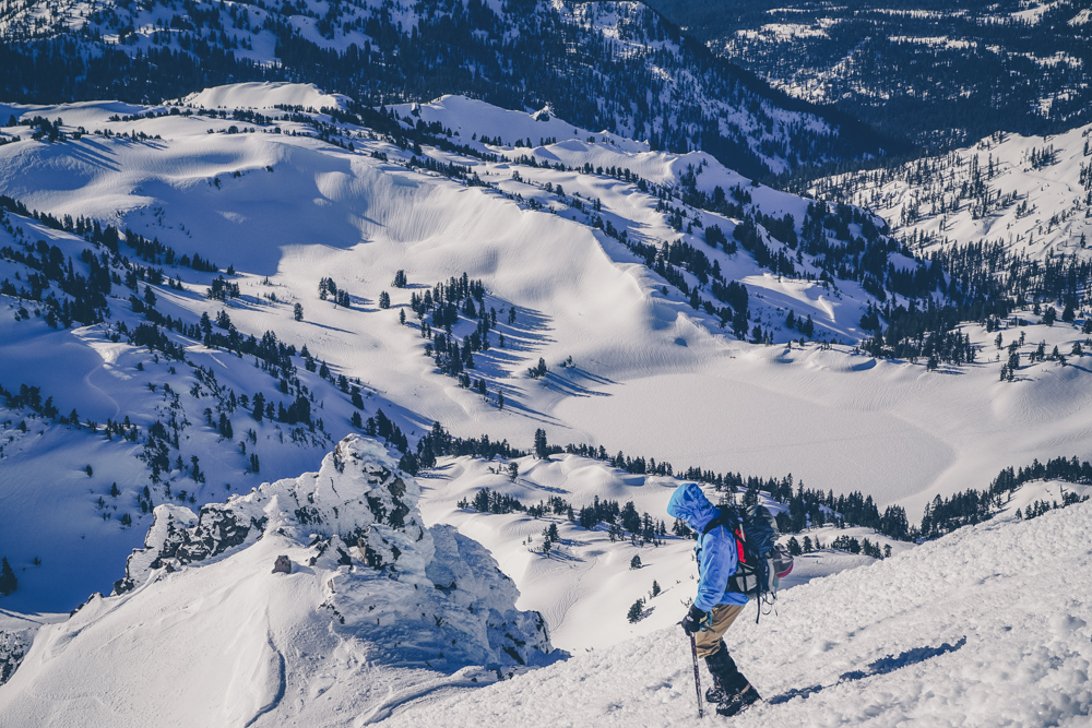 We camped at the parking lot the first night about 10 miles from where the summit is. The next morning we set off and started skinning up the road covered in snow towards Lake Helen