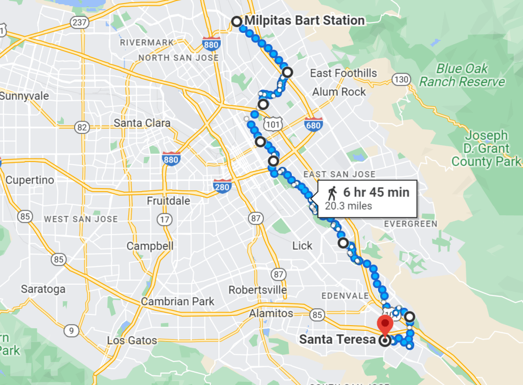 This section of the Ridge Trail is very urban, some is on trail, some is on roads. The trail roughly follows the Coyote Creek, which is very pretty. I ran this segment in Winter 22/23.