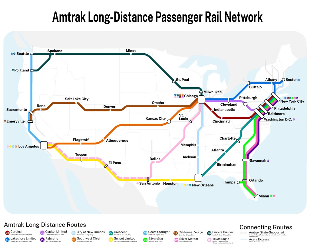 Amtrak Long Distance The current Amtrak long-distance passenger rail network. Potential future network if the long-distance passenger rail plan is implemented.