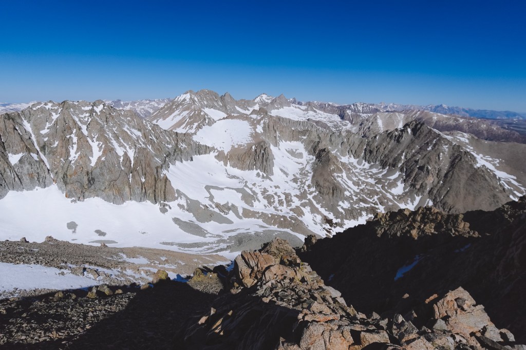 At the bottom of the glissade, I composed myself for a few minutes after the harrowing experience with the avalanches and then started to contour and slowly gain elevation towards the 12,500 foot peak on the west ridge of Tinemaha. The going was slow at times, but I felt strong and was happy to be on rock and not rivers of snow. The views back towards Split Mountain were incredible. Much like Mt. Whitney, it has a much more impressive face on its east side then its west. I marveled at the intimidating Split Couloir, which has somehow been skied by a few brave skiers. I can see why the peak used to be called South Palisade, its steep eastern face looms high over the terrain in a way that only the other Palisades do.