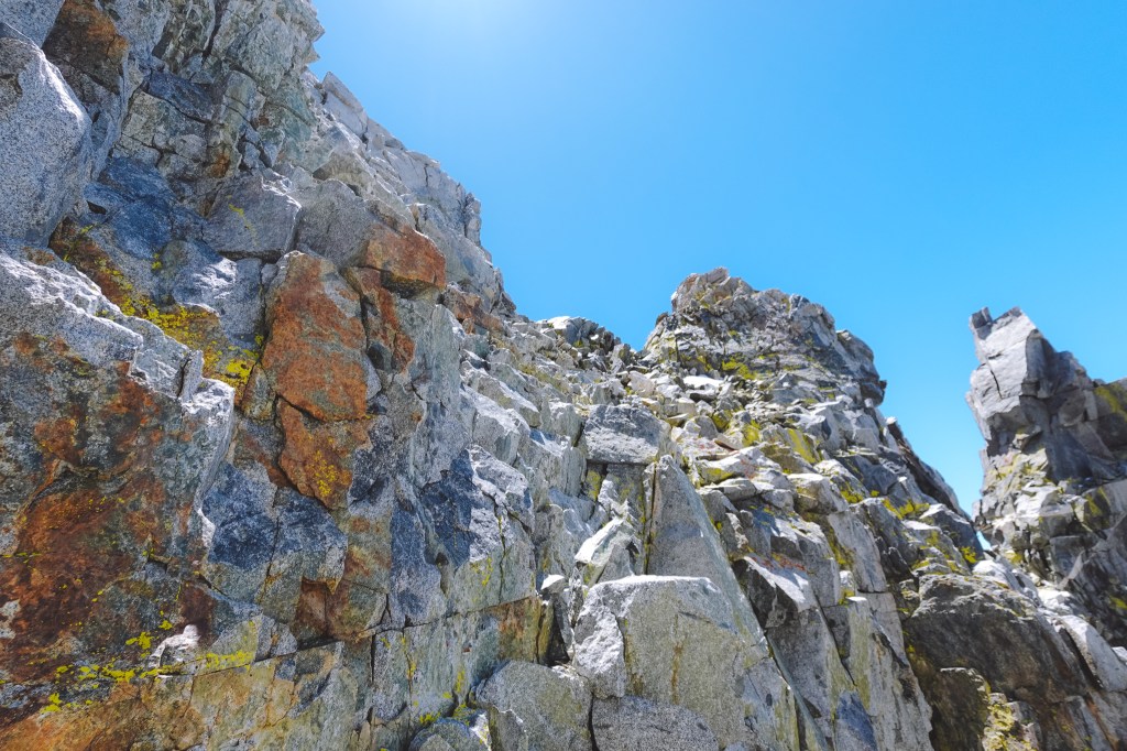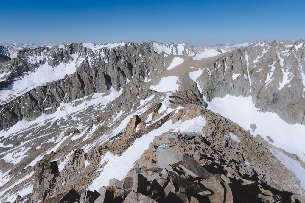 The path to the next summit looked tricky. Bob Burd wrote that he stayed to the west of the ridge to avoid the class four, but I wasn’t sure how far west to stay. I descended a few hundred feet and then continued contouring north for a while, ascending and descending, but slowly making my way through trial and error. I was feeling a lot better after fueling on the summit, and the views into the range to the west were fantastic. I could see PCT hikers moving like ants on Mather Pass below.