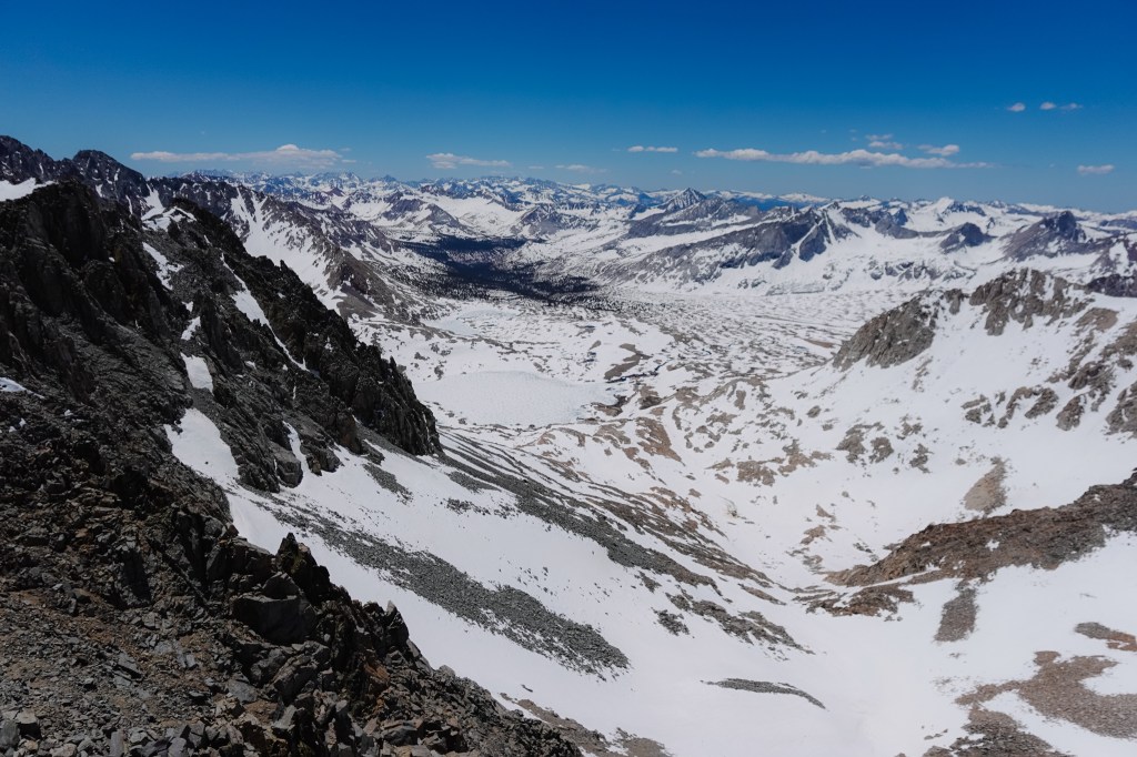It was 1:45 by the time I reached the summit, and I was now over an hour ahead of Bob Burd’s pace. He did his hike with more snow in April, so the times are not that comparable, but it felt good to know that it might not be an 18 hour day after all. After a short and trivial “knifeedge” I proceeded on the broad slopes to the saddle with Split Mountain