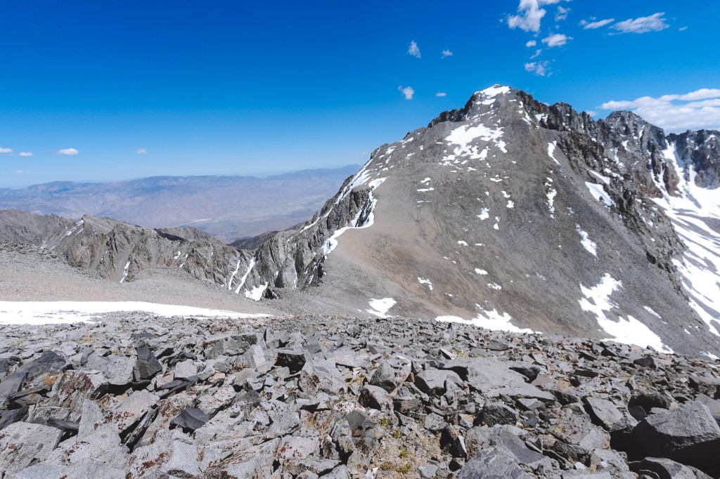 It was a very hot day down below in the Owens Valley, pushing into the low triple digits, and it was even quite hot up in the alpine. I drank two of my three liters of water on the ascent, but luckily we found a pool of snowmelt to fill from near the saddle. As we sat to filter water, Caleb announced he was feeling a bit better and would join me until Lane Pass. We made quick progress on the wide open scree slopes and soon were greeted with an intimidating view of Bolton Brown.