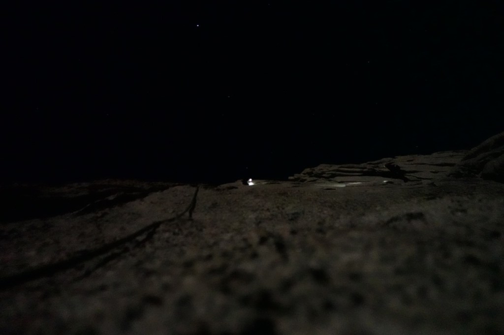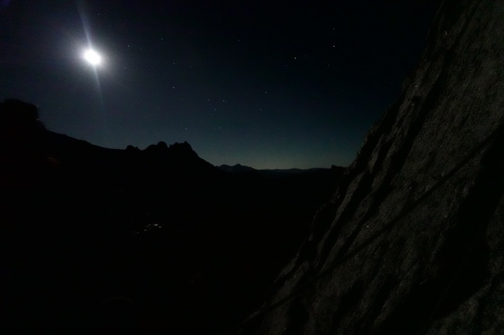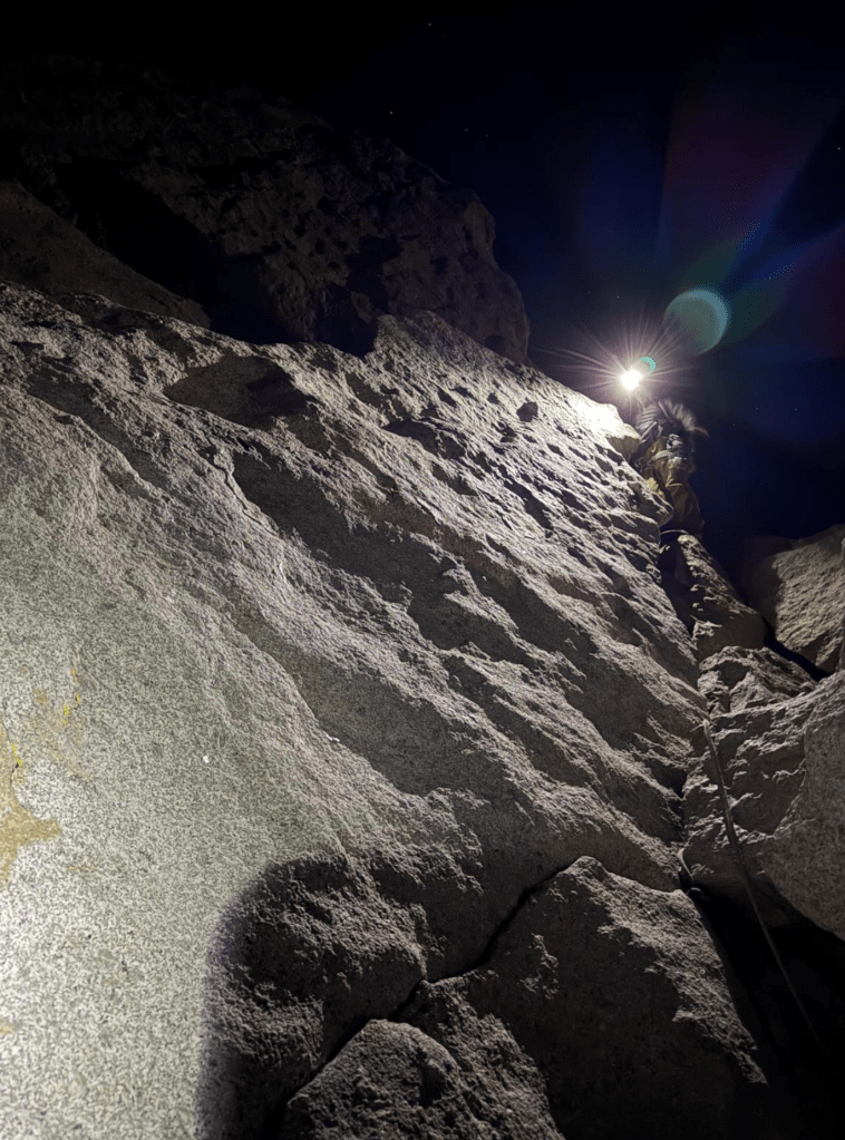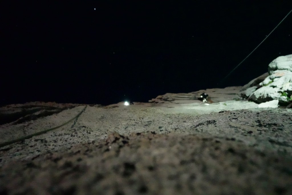 Climbing in the dark is very disorienting. I really had no idea where we were on the peak. It was a full moon, so we could make out the mountains in the distance, but we usually had out headlamps on for the climbing itself. Luckily we found nice belay ledges consistently. With three climbers, we could all take turns belaying and take turns enjoying the scenery. As the night crept on, it was getting colder and colder, and the exhaustion of the night was catching up to us. I began double checking basic belaying things with Anthony and Fiona, not wanting to make a mistake in my exhaustion. I much prefer starting early to going into the night, as I feel a lot more mentally with it starting early.