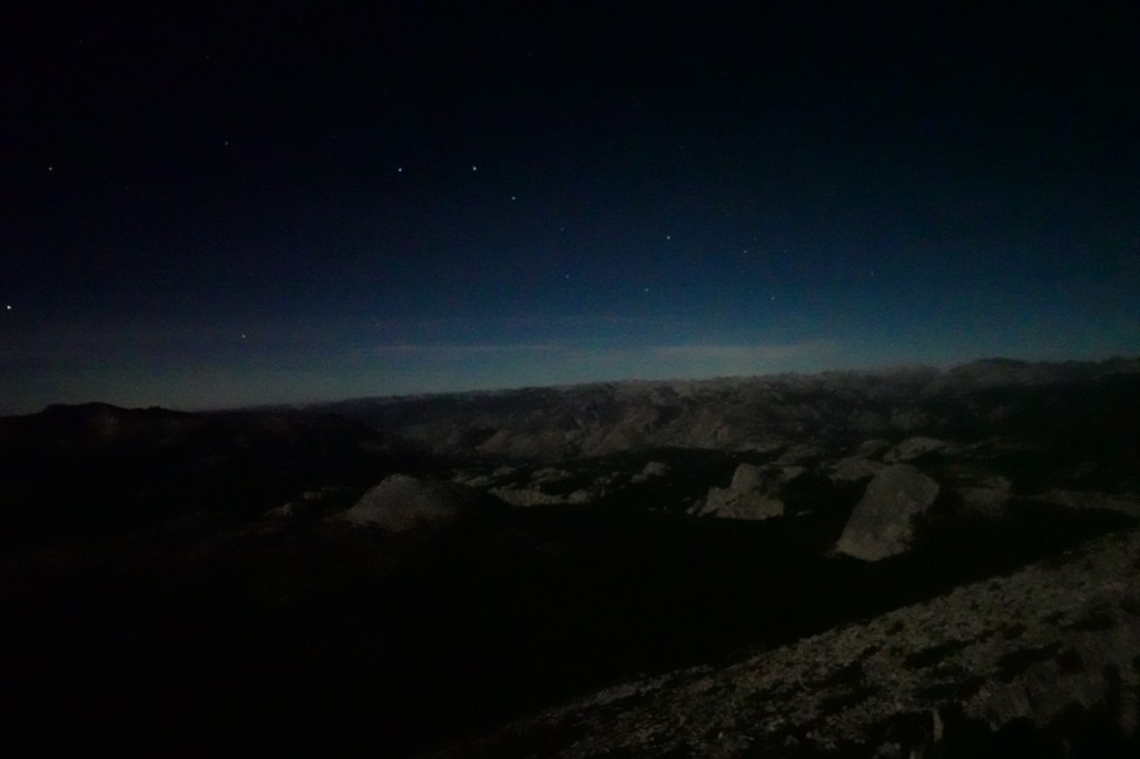 In the distance, we could make out the lights of the Central Valley, the Clark Range, Lyell, Dana and Conness. I would like to return in the day sometime to truely appreciate this summit better. It was neat to see it in the dark though. It felt like were on the tip of an island floating in space.