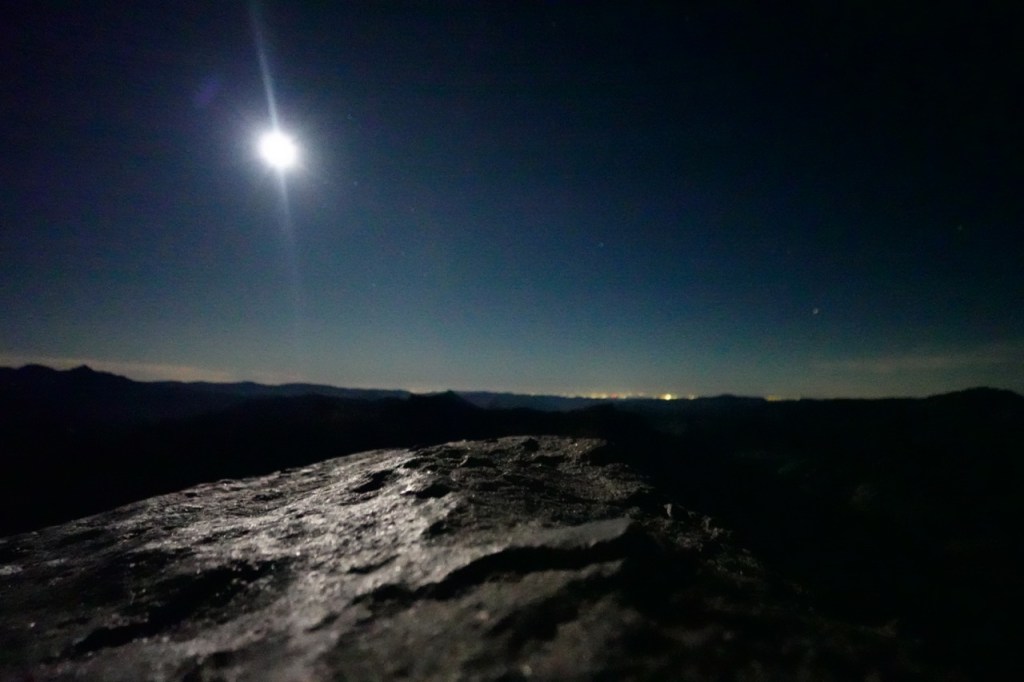 We sat there for a while with no sign of George and company. Anthony was starting to worry as he had work at 7am the next morning. We summited at 12:30am, so that shift was quickly approaching. After an hour, we still had no sign of George, except for some garbled talk on the radio. Somehow, we were able to pickup a conversation in Spanish over the radio from who knows where. Finally, we were elated to see George’s headlamp crest over the rock and he joined us on the summit, his friend joining us shortly after.
