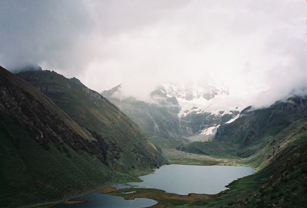 As I descended over the pass and out of the clouds a lush green landscape greeted me. I continued into the mountains through the storm. The rain began to fall harder and harder. As I passed Laguna Jahuacocha, the rain began to turn to snow. I continued up towards Paso Rondoy. Atop the pass, there was about an inch of fresh snow. I continued along in the frigid temperatures, getting colder and colder now that I was no longer climbing. Finally after descending a few thousand feet, I was getting too cold, so I setup camp on the hillside. It took me a few minutes to warm up, as I was totally drenched and freezing. I had some cold soaked food, and rested for the night.