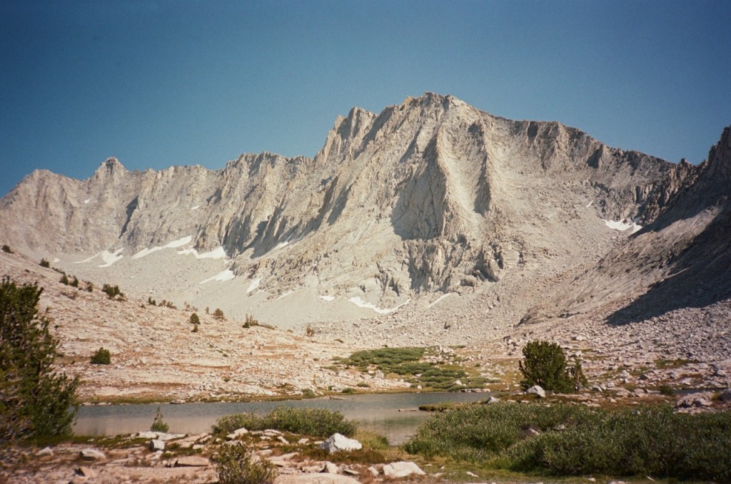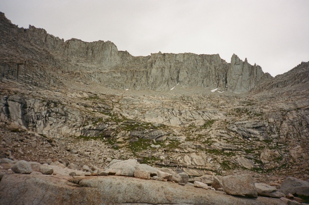 We began the long descent towards Sphinx Creek. We could see Brewer and its Guards, so close but days away. Noe and I had a very interesting conversation about a potential ARC Storm in California: a large flood that could push the state to its limit. This soaked up two hours or so of time. I took a nice bath in Bubbs Creek, and then we began the steep climb up towards Avalanche Pass. This is a masterful piece of trail work. Steps must have been blasted into the granite face. I am always suprised to not see any people on this beautiful trail. In Yosemite, a trail like this would be crawling with tourists.
