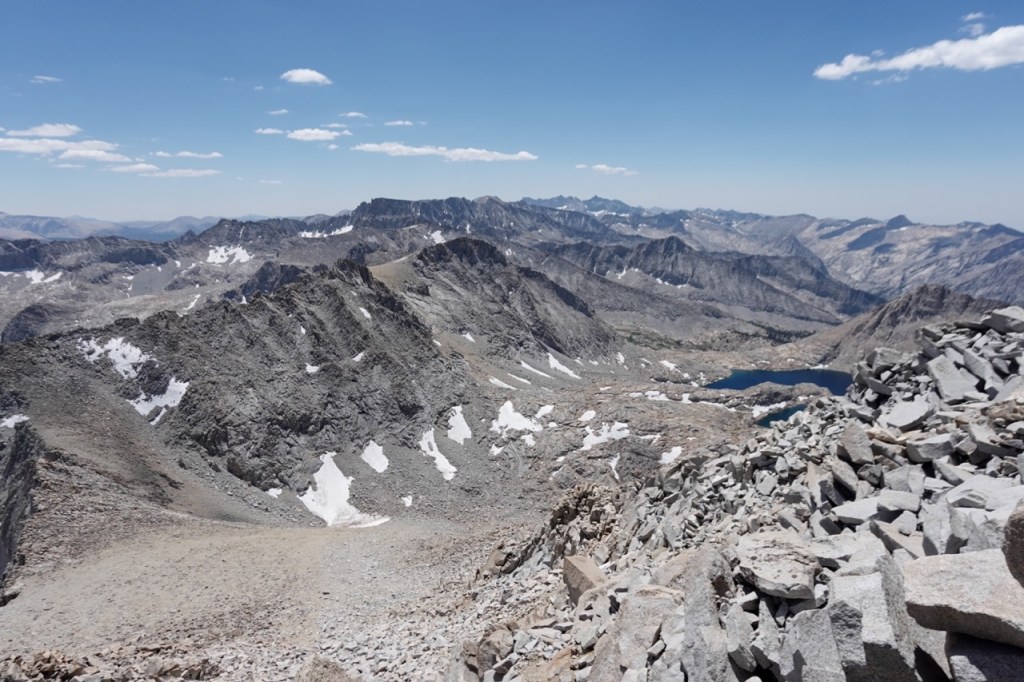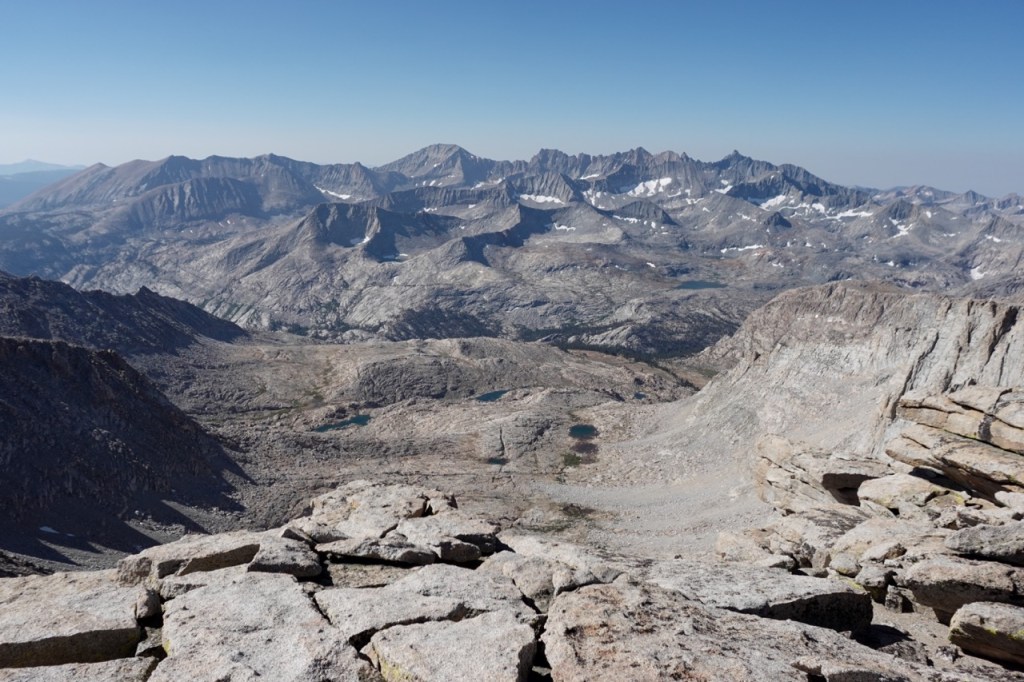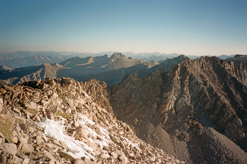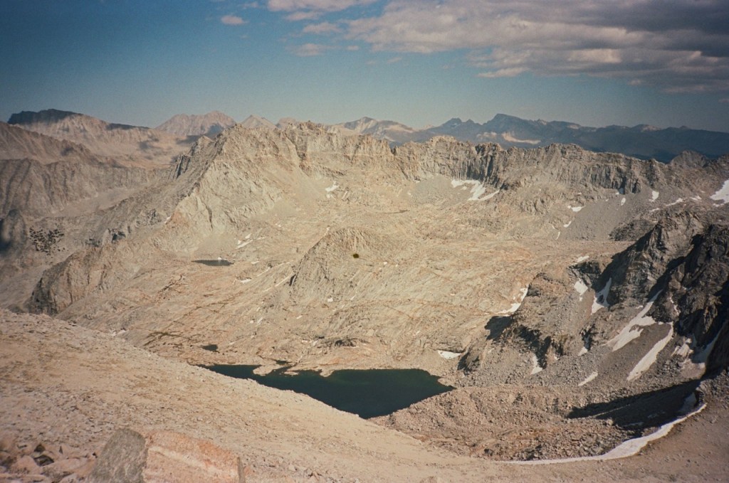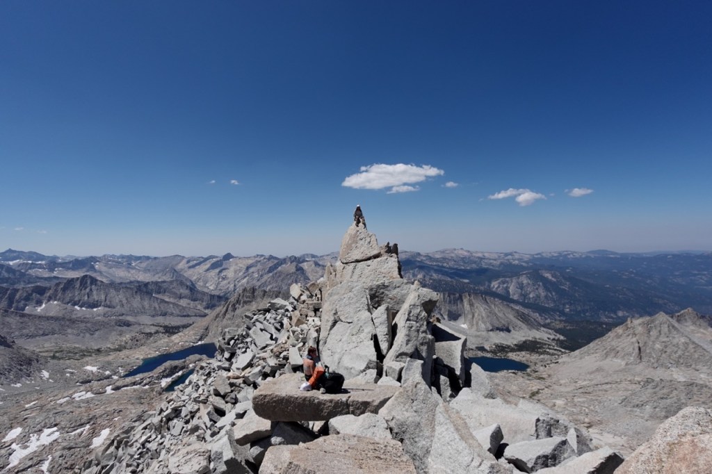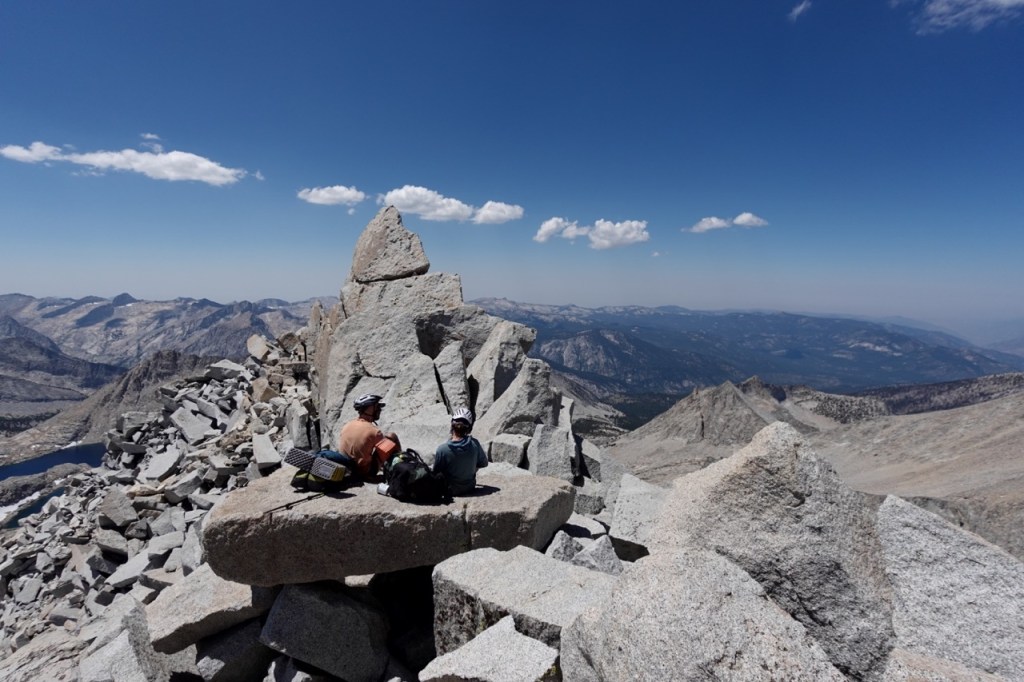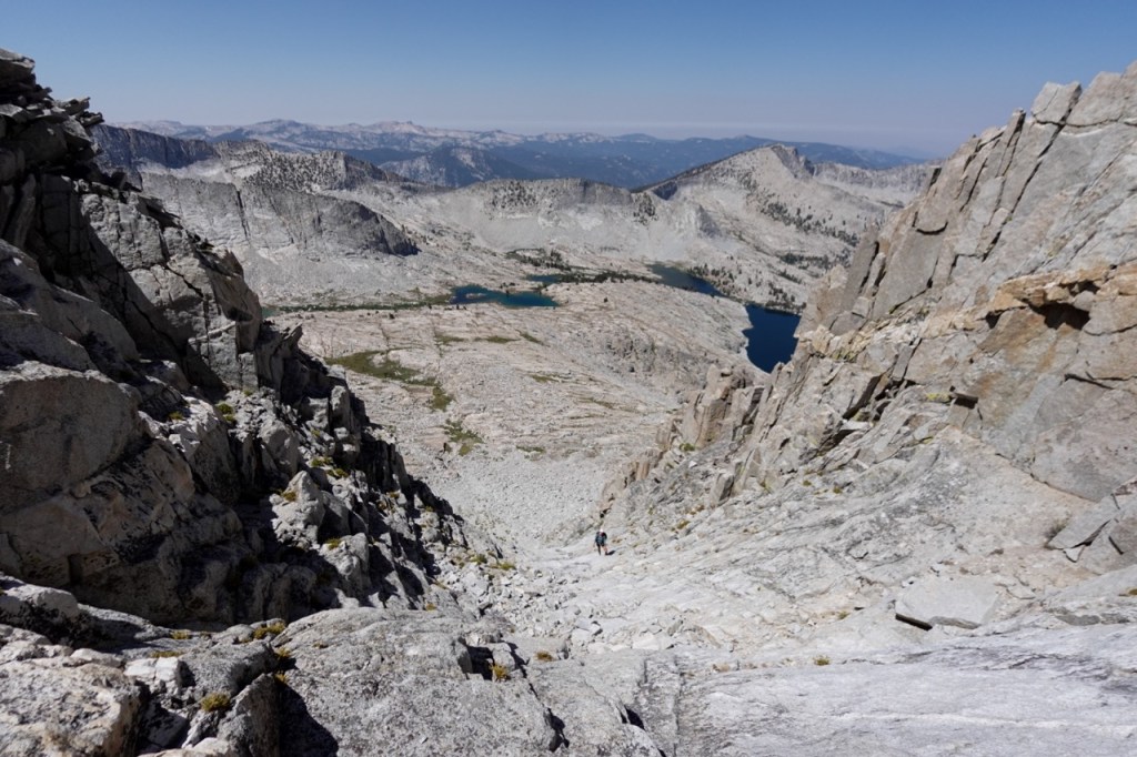 We followed a beautiful chute of solid granite, which took us almost to the top. We all tapped the potato chip like summitblock, but none of us dared mount it. From the top, we had excellent views north back across Bubbs Creek, and great views of our next few days south towards the divide.