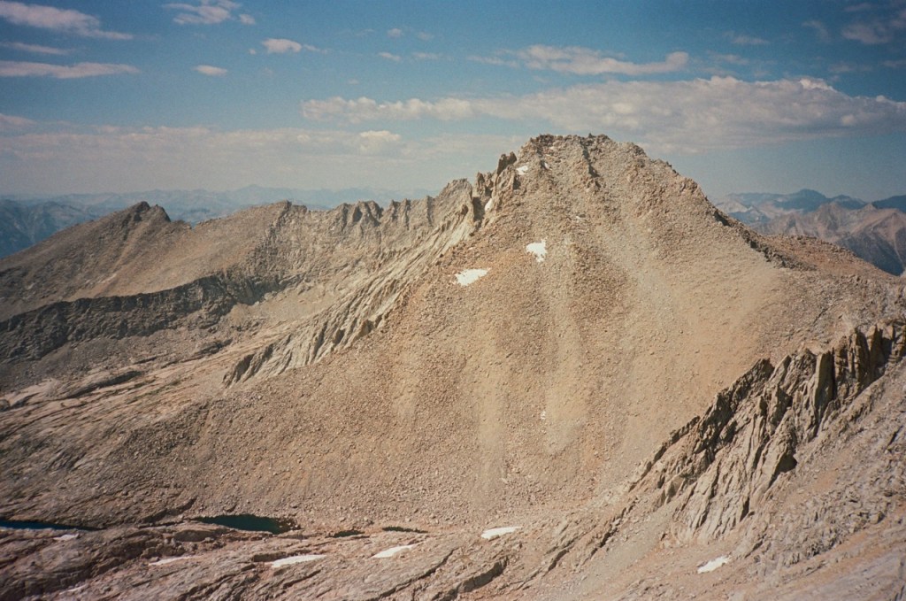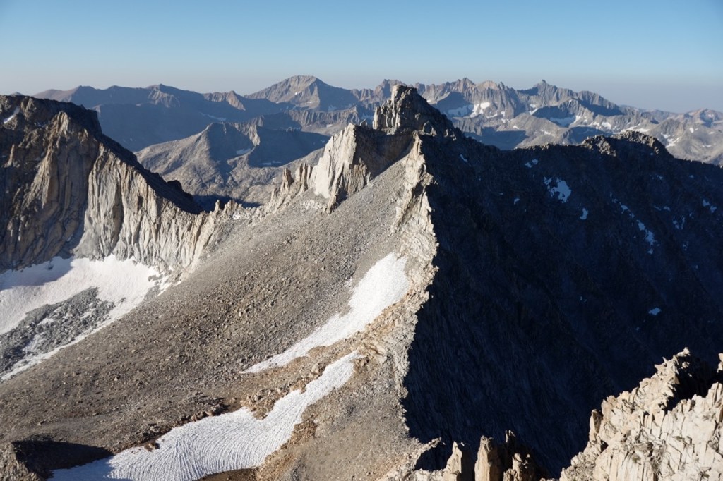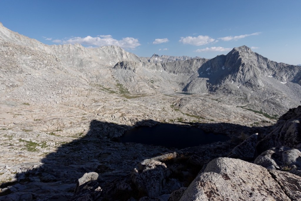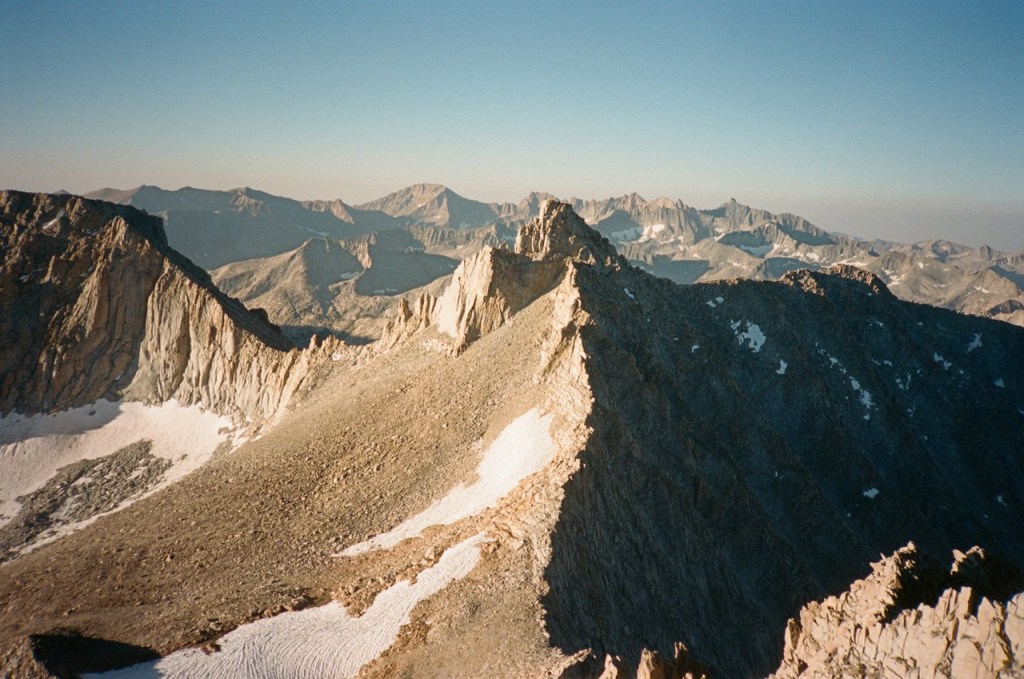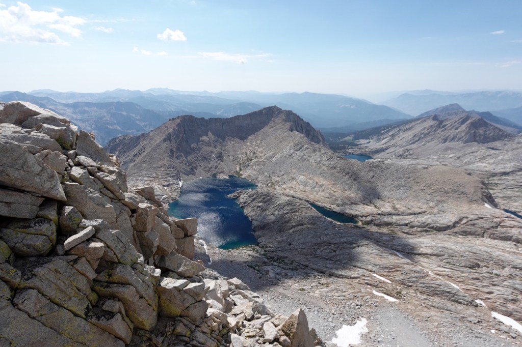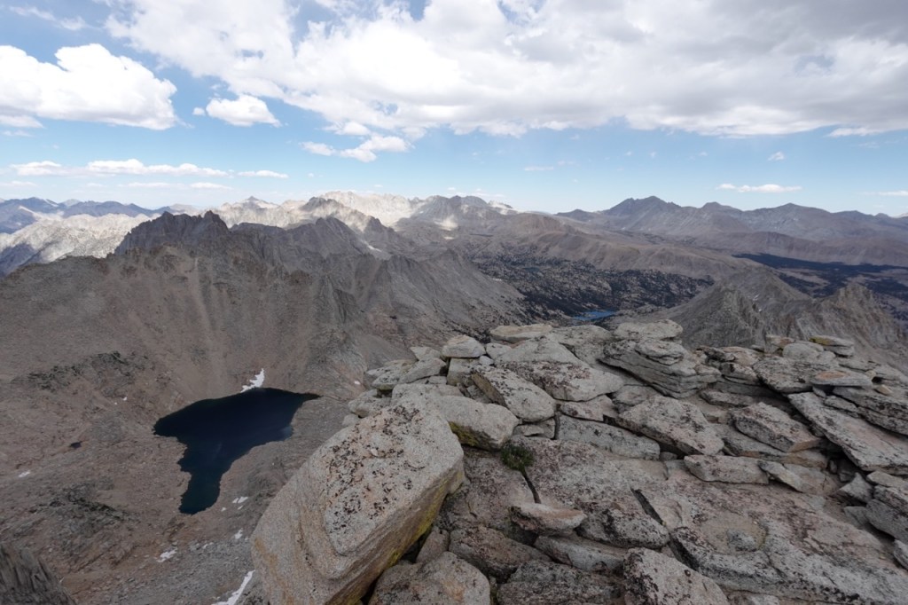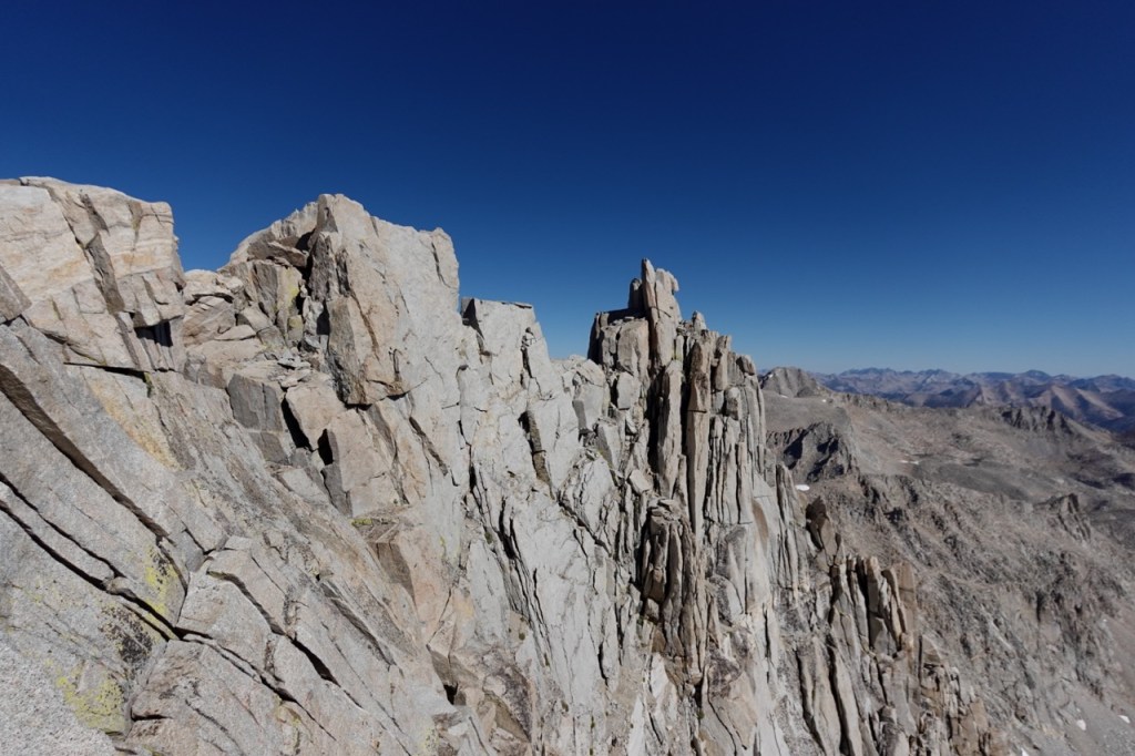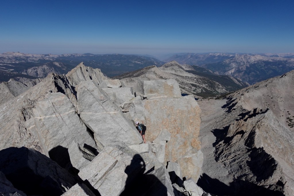 We followed a beautiful chute of solid granite, which took us almost to the top. We all tapped the potato chip like summitblock, but none of us dared mount it. From the top, we had excellent views north back across Bubbs Creek, and great views of our next few days south towards the divide.