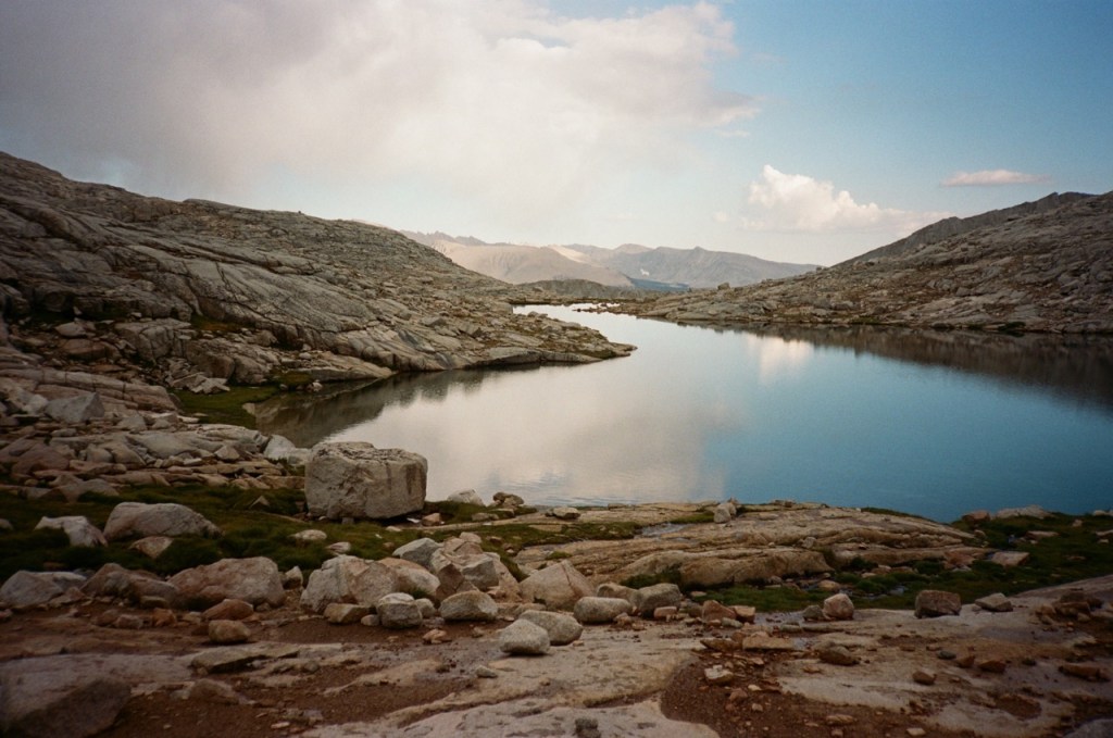 At last we made it off the wide ledge that seemed to go on forever and onto real class two ground. We descended down to the lake and sheltered under a rock just as the storm began to regain steam.