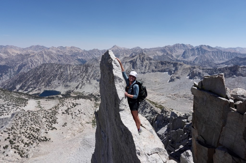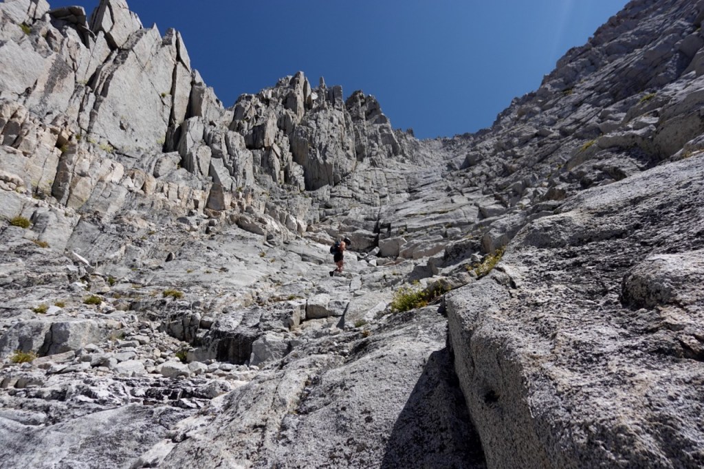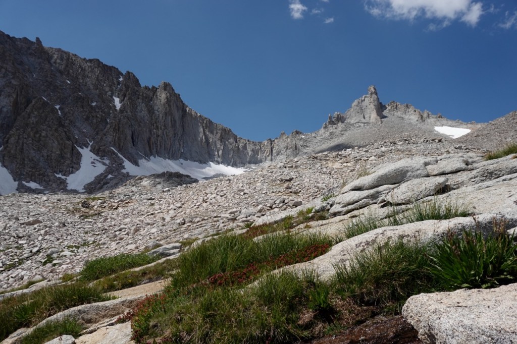 We had one more climb of the day up to South Guard. We were tired from the first two peaks but we trudged on up the pass. The going got very loose, but luckily we spread out quite a bit. I took the far left, Noe took the center, and Bridget the far right. Noe sent some huge rocks down the chute, but it didn’t matter as we were out of the way. We found ourselves on the wide summit plateu and it was a nice easy walk to the summit proper. We marveled at Brewer towering to our north, and started scheming for Thunder the next day.