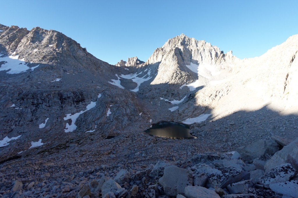 The pass down the other side was pretty loose, but luckily nothing like Thunder Pass. We spread out nonetheless to be on the safe side. At the base of the chute, I got to swim in a tarn with a great view looking back to Thunder Mountain.