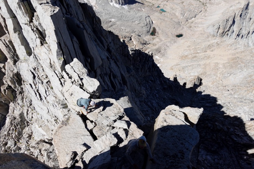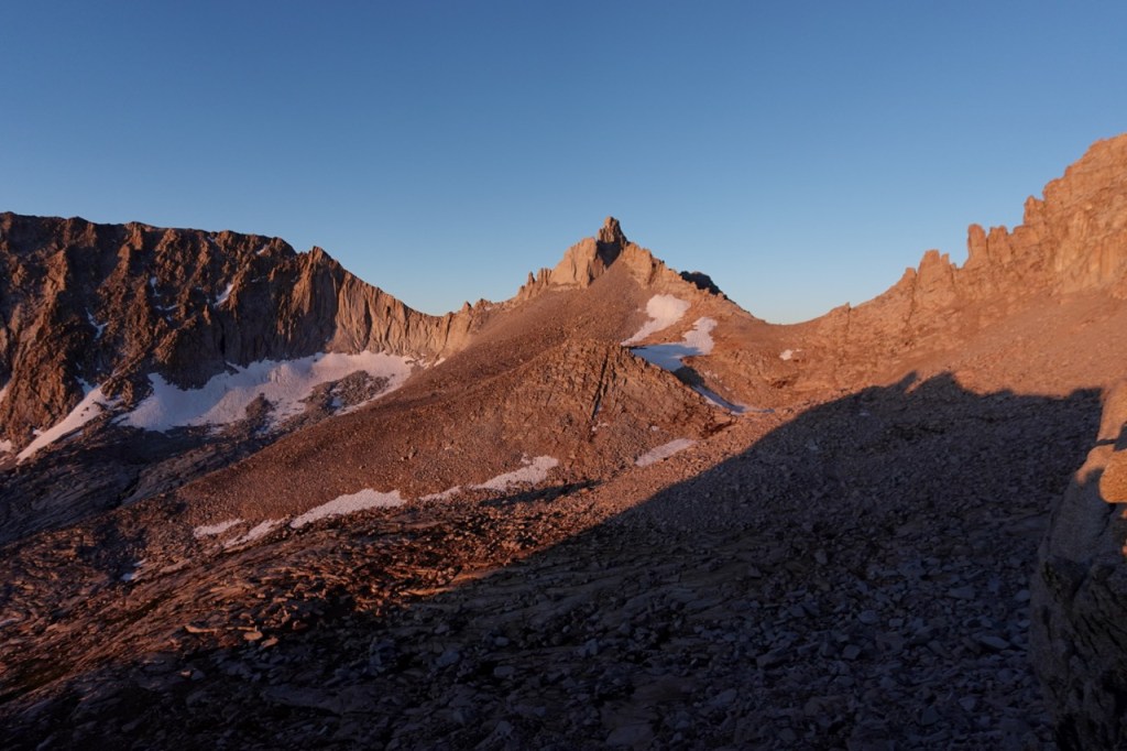 Day 4 began exactly as planned. We got up at 4:45am. By first light at 5:30, we were making our way towards Thunder Pass. I got a bit ahead of Bridget and Noe, which ended up working out in our favor. Thunder Pass was exceptionally loose. Half the holds I grabbed tumbled well down below. Rocks were sliding below me left and right. I was relieved to be well ahead of Noe and Bridget, and tried to move quickly so that I topped out before they moved beneath me. I saw Carlos on the ridge, and I made quick work of the last few hundred feet.
