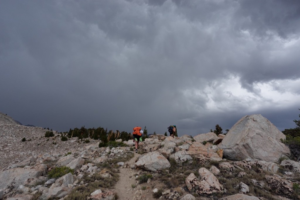 We got a nice rest in and the storm passed. We debated camping there, but reinvigorated from the rest, we continued on. Somehow we threaded our way across the PCT without seeing a soul. We setup camp at 7pm at the pass. Carlos began sprinting furiously up Tyndall into the fading light.