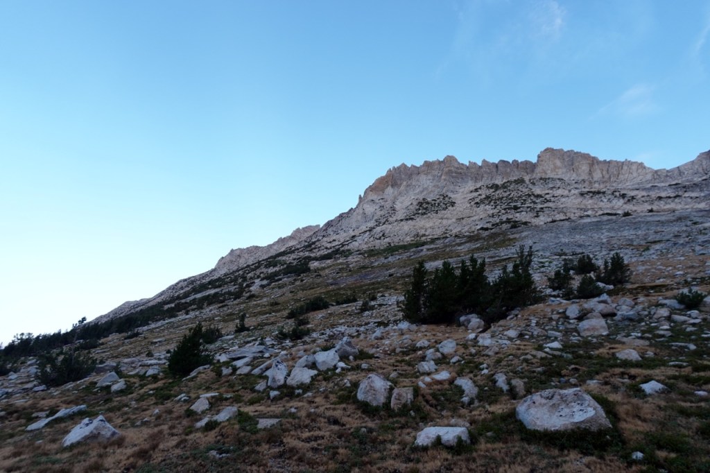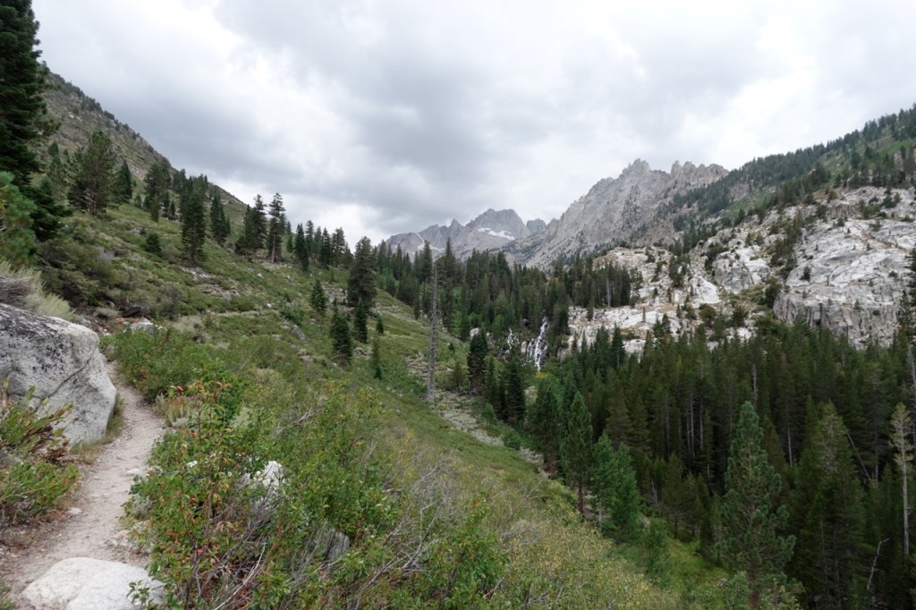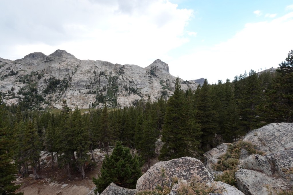 I sat under the tree and awaited a break in the storm. The storm’s intensity was only increasing. At last, I hadn’t heard thunder for five minutes, so I made a run for it. I hoped and hoped that my gamble would pay off. I was met with sheer cliffs on the far side of the pass. Thunder cracked in the distance. I began to descend the slippery rock, but quickly thought better of it and turned around. Upon second inspection, a better route presented itself, I contoured left, and was pleased to see rocks fade to forest beneath me. I continued to contour as the storm picked back up. Now I was in Virginia Canyon, relieved to have lots of higher peaks to serve as my lightning rods.