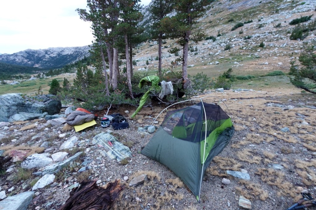 I continued up Virginia Canyon, planning to establish a basecamp around the treeline. The rain began to fall harder and harder. My feet plopped through the wet grass. It felt like I was in a Patagonian or Alaskan tundra. All of my clothes were drenched through my tattered froggs toggs. I was sopping wet when I set up my tent in one of the last stands of trees. Luckily most of my belongings were dry, and I settled in for a long wait. Every few minutes I peered out of my tent to main eyes on the sky. The storm did not seem to be relenting. Rain came in waves, and wind rocked my tent. Thankfully I had my tent. The tarp surely would not have fared well in these conditions. Maybe if the storm stops by 6:30, I can try Whorl. 7pm at the latest. The times all came and went, and I drifted off to sleep at last light. I was awoken multiple times throughout the night by bright flashes of lightning and by the violent force of the storms. A tent high in the mountains during the storm. Not a great place to be at all.