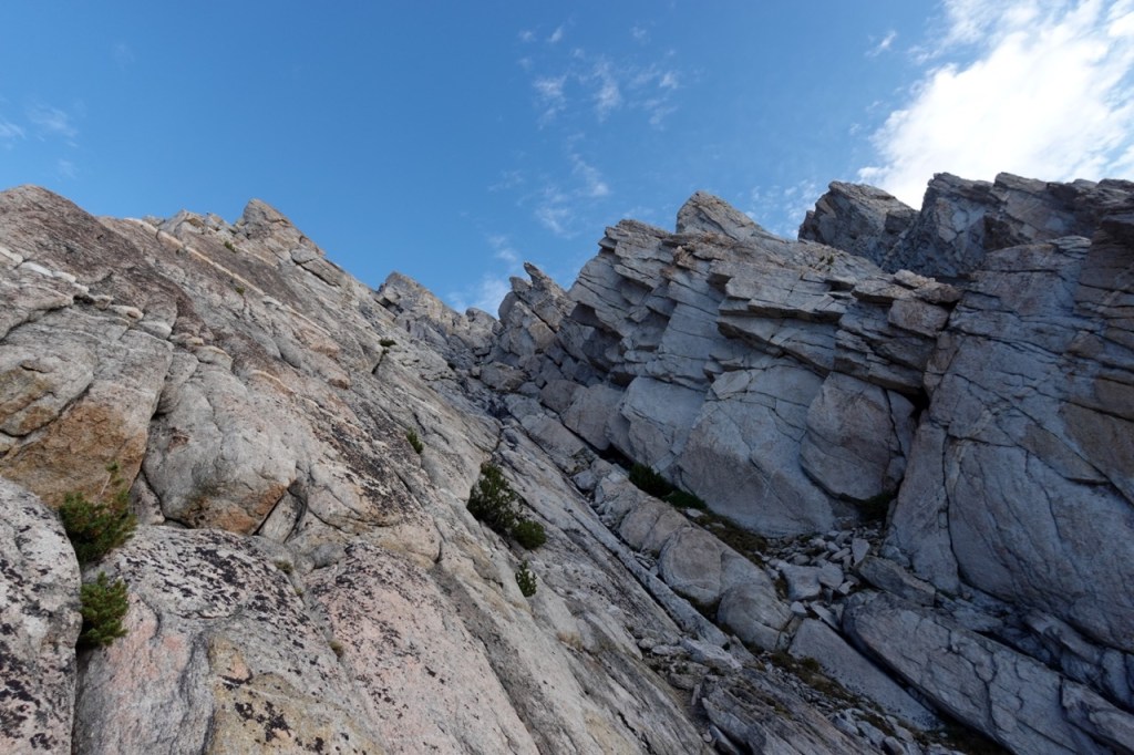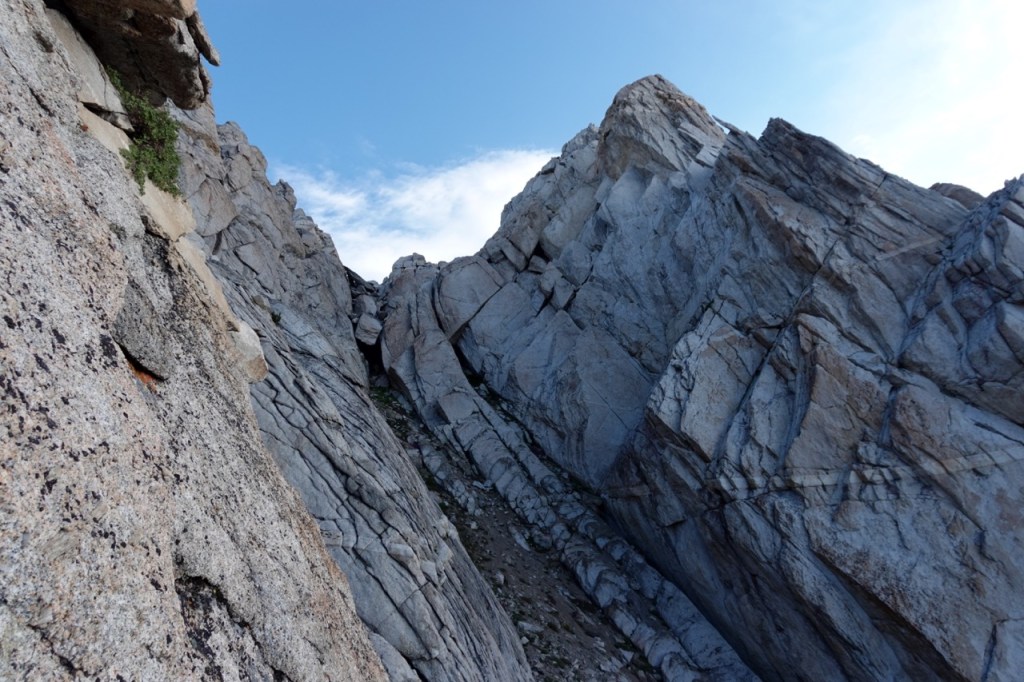 By the time my alarm went off at 4:30am there was still soft drizzle going on outside. I drifted back to sleep, resigned to not climbing any more peaks. Somehow by 6am after 21 hours, the rain had mostly stopped. I figured I’d have a short window before the storms began again. I almost ran up whorl, sucking in air as I climbed up the steep slope. I had studied the beta repeatedly the night prior, so I knew it by heart. Up the third chute, find the ledge. Over to the second chute. 50 feet past the thumb, cross to the third chute. Crawl through the dark under a pile of chockstones. An unlikely ledge leads to the summit.