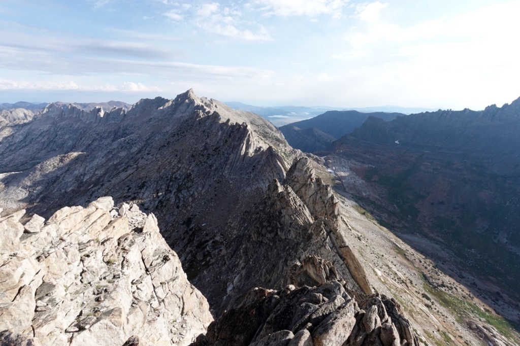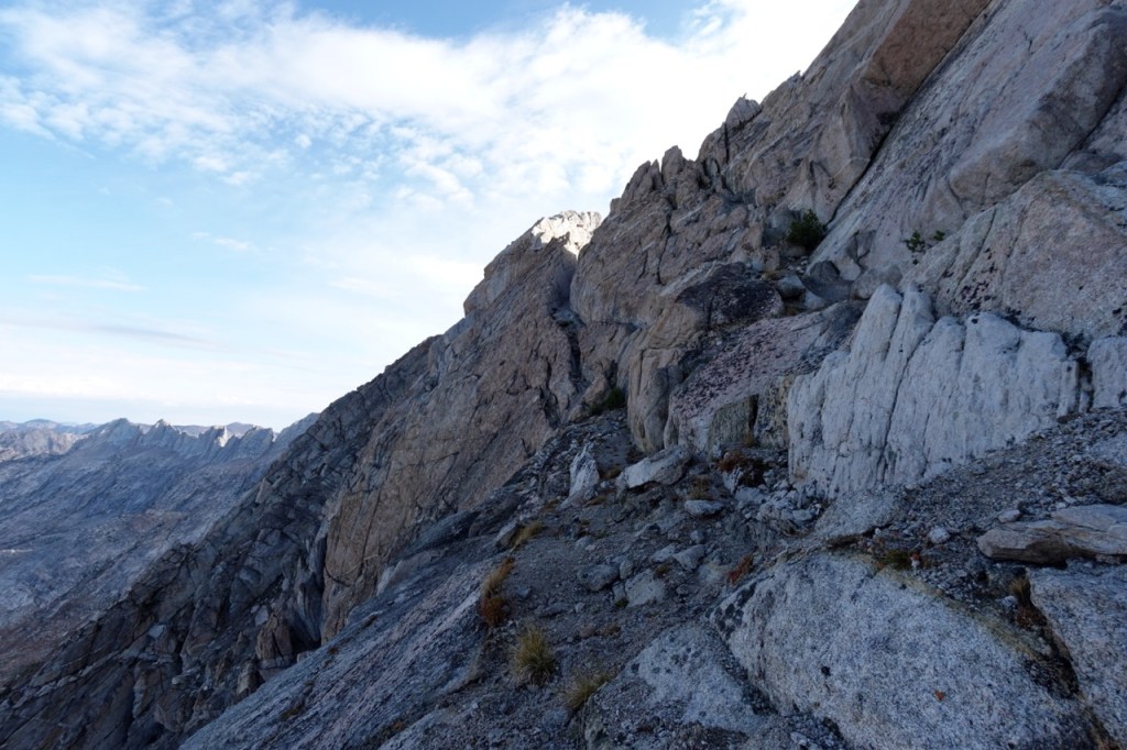 Luckily my route, heading more south and approaching the mountain from a different angle mostly worked. Near the top, I had to make a few 4th class moves, but soon I was on the summit plateau. I sat for a few minutes pleased with my more sporting route, and watched the storm start to build to my east on the Sierra Crest.