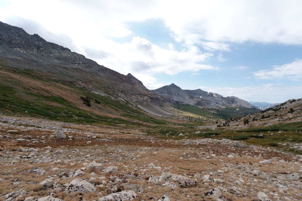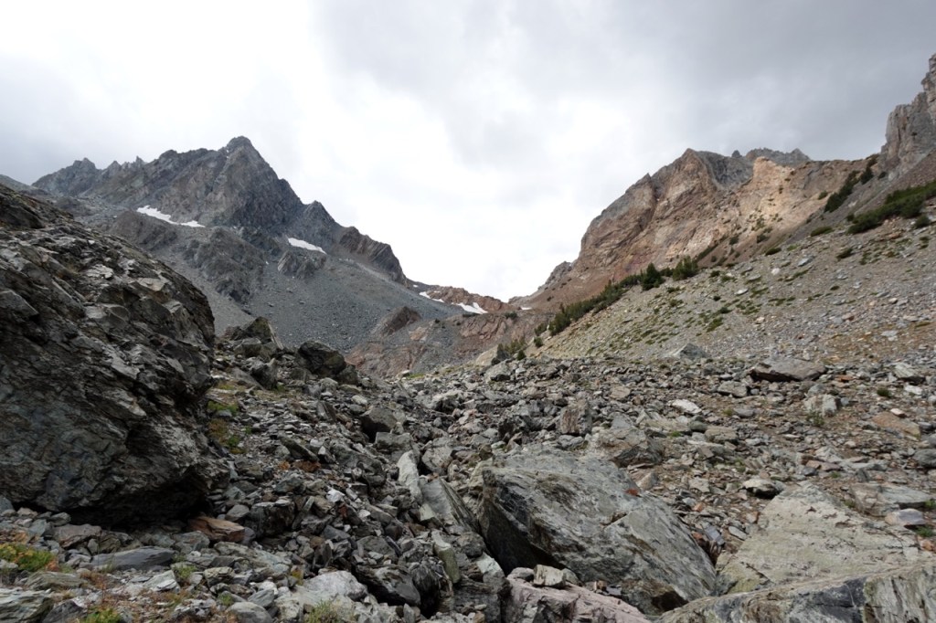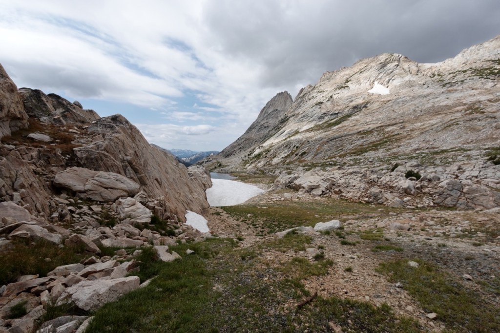 I didn’t linger long though. Clouds were already massing. Another storm was surely soon to come. I considered staying another day couped up in my tent. I had the food, but I didn’t have the motivation. I feared another long night nervously waiting in my tent while lightning rained down. Eyes on the sky told me I could not hike Virginia and Twin this morning, and I would have to come back later. I hastily packed my bag and headed up and over Horse Creek Pass.