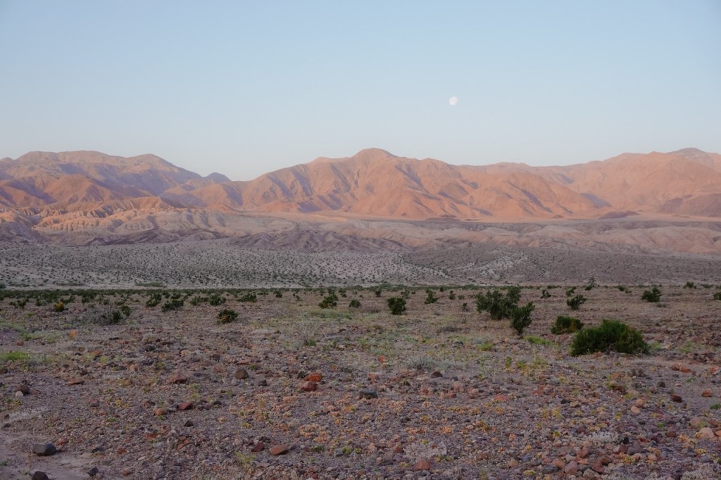 We each packed 6l of water and headed off into the desert. The first rays of light hit the Owlsheads as we started to make our way up the alluvial fan.