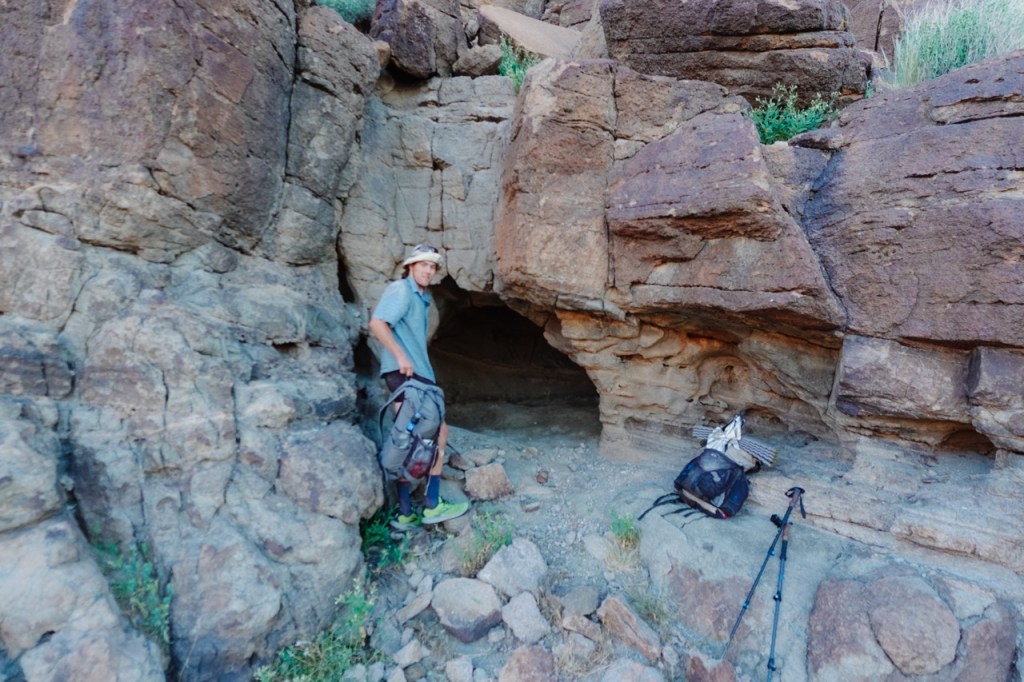 As night began to fall, it started to rain again. I joked that maybe we could find a cave, despite not seeing any all day. Luckily enough a cave soon appeared a few hundred feet up the cliffs on the right side of the wash and we camped there for the night.