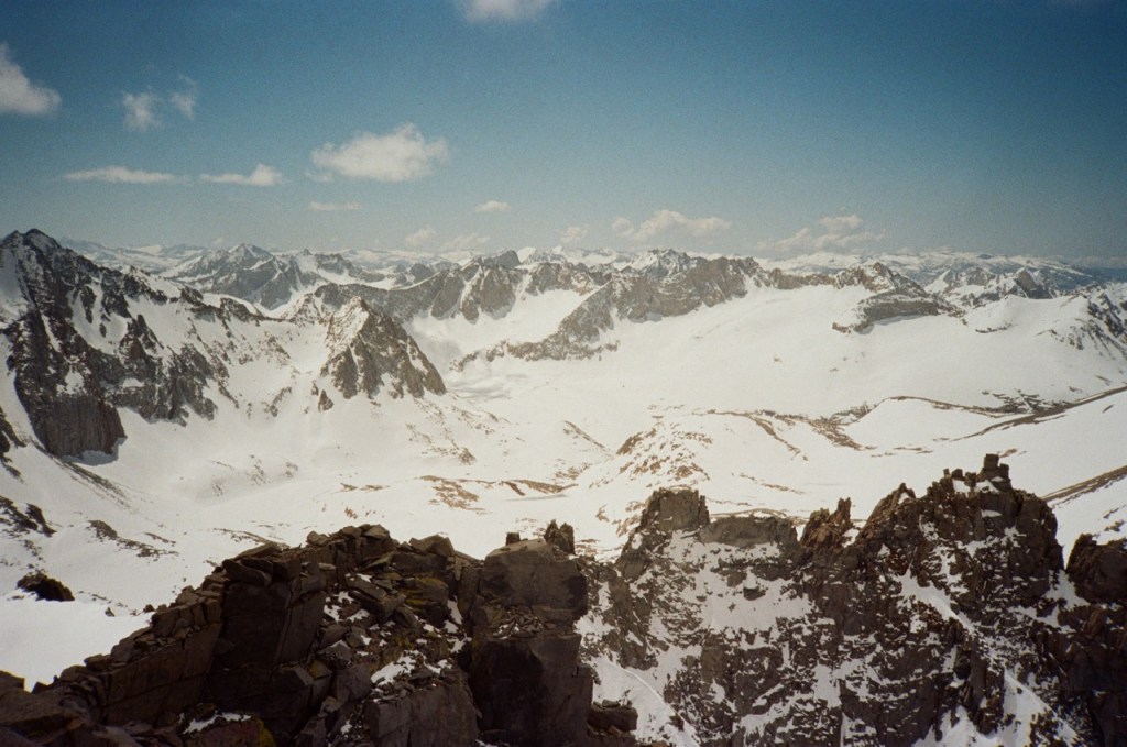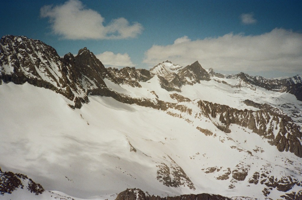 After many hours, we made the summit at last. We were greeted with incredible views north towards the jagged Palisades, south towards Split Mountain, Bolton Brown and Prater, West towards Palisade Creek and west towards Birch Mountain. We sat for a bit and took in the views.