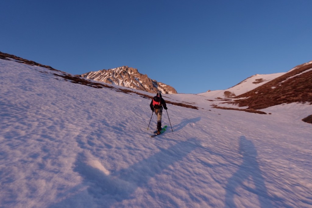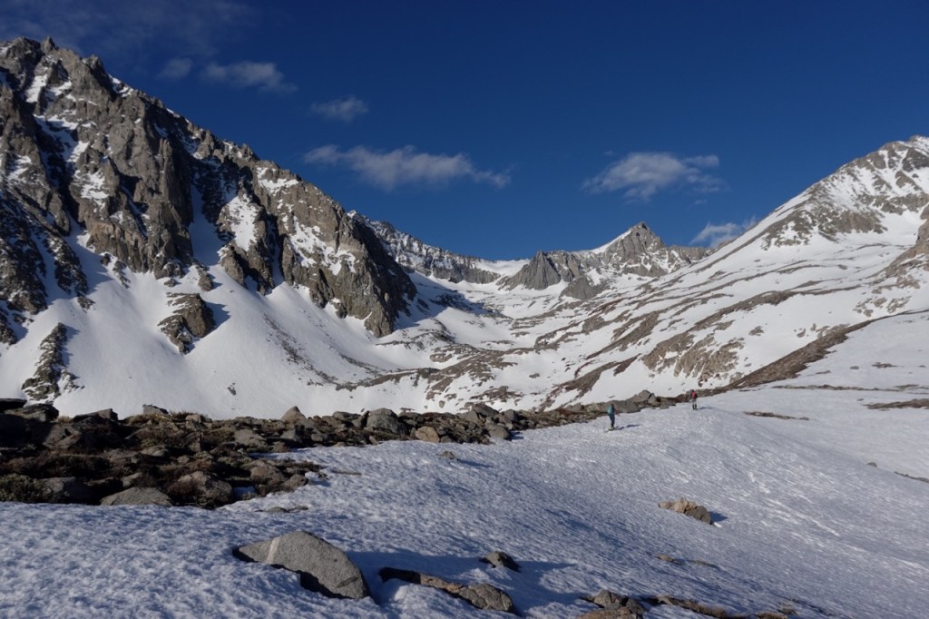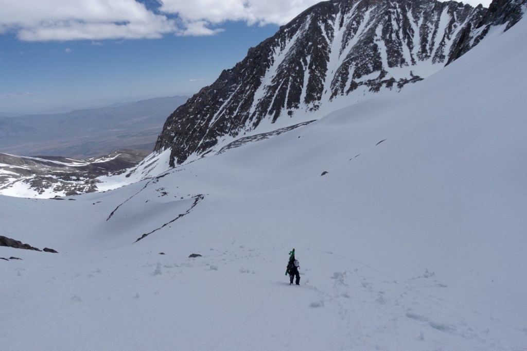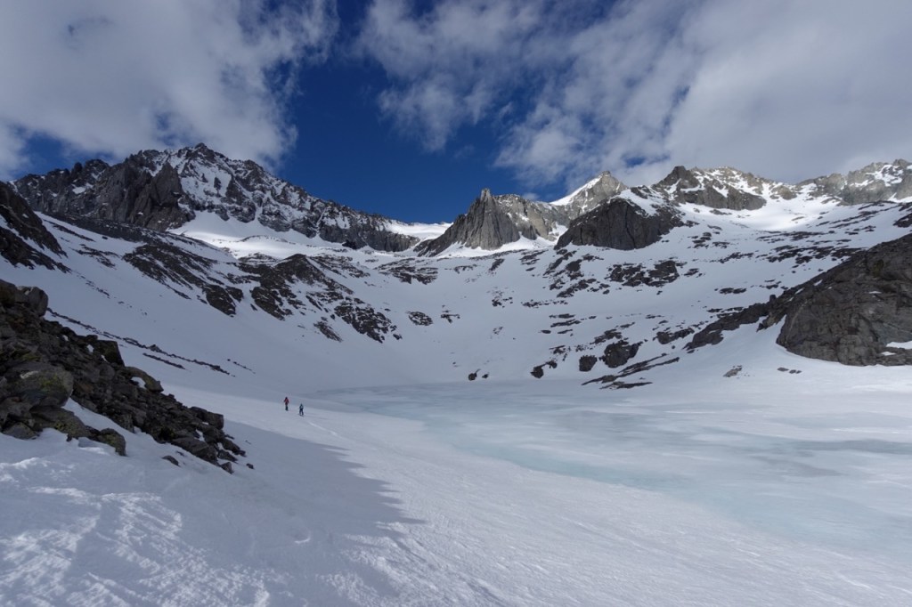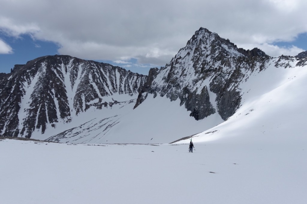 Then the skiing began! The snow was still a bit hard but edgeable at the very top, but quickly became perfect corn. All of the slopes that had taken us hours to climb up, now flew by in seconds. It was some of the best skiing of my entire life. Throwing turns through the corn in this beautiful setting. Noe and I skied down in unison. I linked my tracks with each of his. We both let out howels of delight. Bridget claimed she was not a good skier, but she managed to negotiate even the steep slopes with grace and was never far behind.