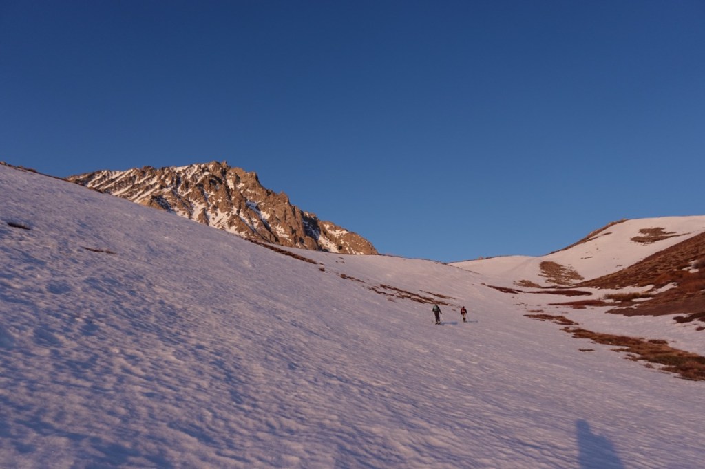 We awoke in the middle of the night and began the massive climb up the peak. We were down amongst the sagebrush at 6,200 feet, and the peak towered some 7,000 feet above us. We made great progress those first two hours — two steep hours through the darkness that brought us to the snow.
