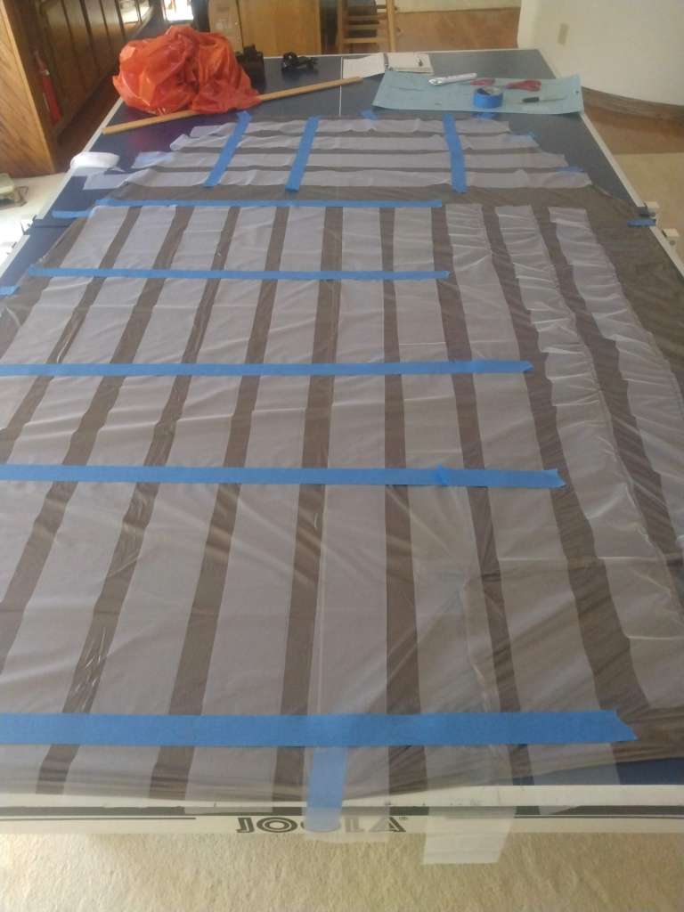 For this step I laid out the sheets on my parent’s pingpong table. It definitely helped a large flat surface to work on. A hardwood floor or a concrete slab could also work. I marked out where all the baffles would go in sharpie on each sheet, which made sewing them on a lot easier. I cut and hemmed each sheet. There was a bit of extra material left over. Some of which I used for the foot box. The rest was good material to practice sewing and hemming with.