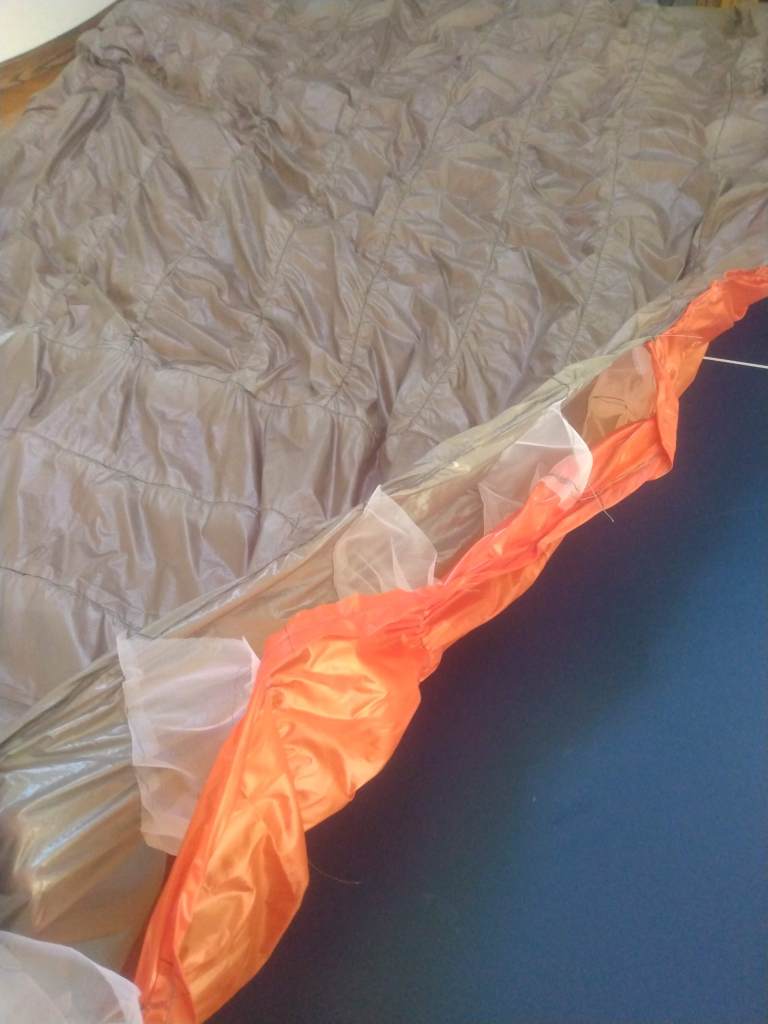 This step takes most of the time. I had 15 baffles to sew on, so 30 seams to sew. The first few took a while but then I got quicker as it went on. I started to pre tape the baffles ahead of time which lead to more exact and less stressful stitching. When attaching the inside layer half, I started with the vertical baffles and then sewed on the horizontal baffles at the end.