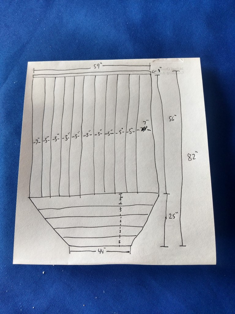 81” height, recommended to make it your height plus 8-9” 59” width, used full width of fabric 44” footbox 11 vertical baffles, 56” by 5”, side two baffles are bigger 5 horizontal foot baffles, 5″ long 1″ on top for cinch strap
