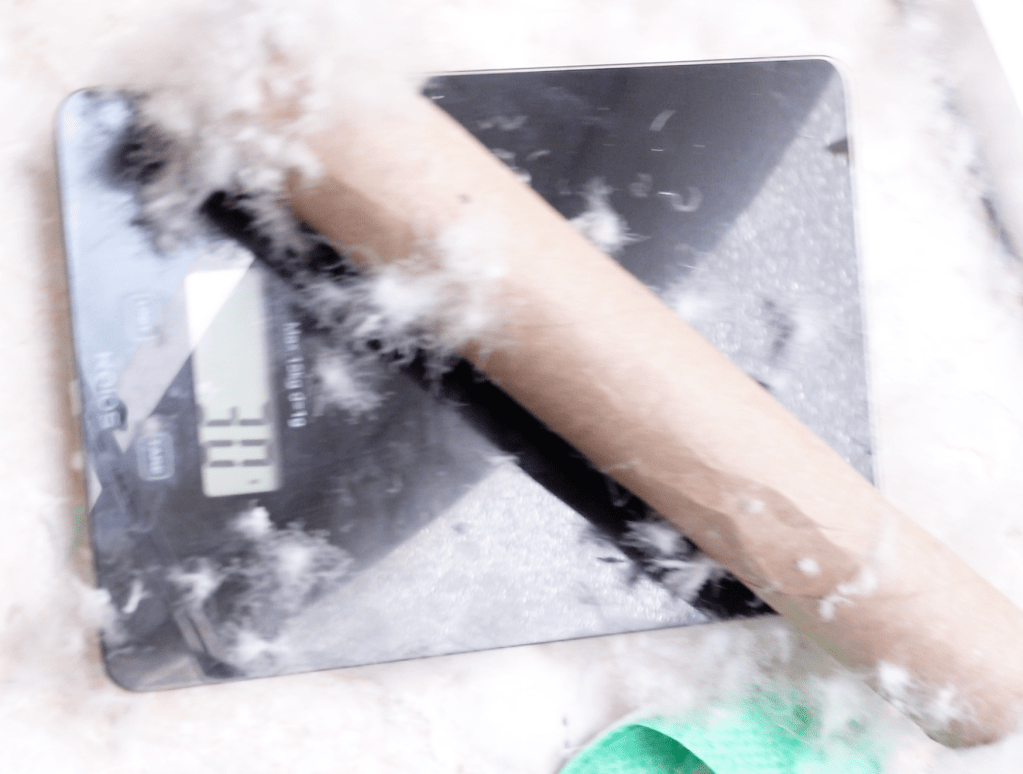 I had heard horror stories of filling down. It was definitely stressful, but overall it wasn’t too bad. I went inside the shower at my parents house, covered the drain, and got to work. I did some calculations to figure out how much down to put in each baffle and then filled a paper towel roll with the correct amount of down. I used a broom handle to push the down out of the paper towel roll and into each baffle.