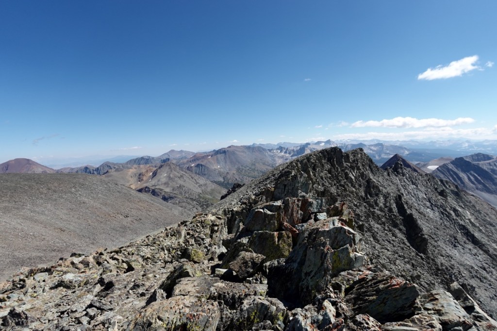 Fall had definitely advanced in the two weeks since I returned. The morning walk amongst the yellow aspens started out chilly, but the climb quickly warmed me up. The trail approaches the peaks circuitously — going up and down over multiple passes. Eventually though I found myself at the base of Virginia. I dropped my pack at the saddle and scampered up towards the summit.